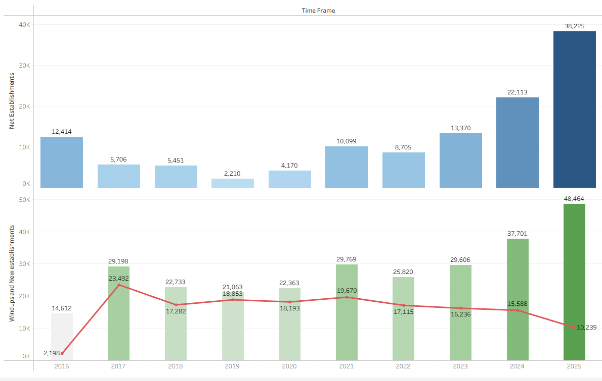 The top chart is the ‘net number’ of establishments per year since 2016. Currently showing 38,225 for 2025. This number will likely reduce as ‘windups’ can take a while to filter into the data