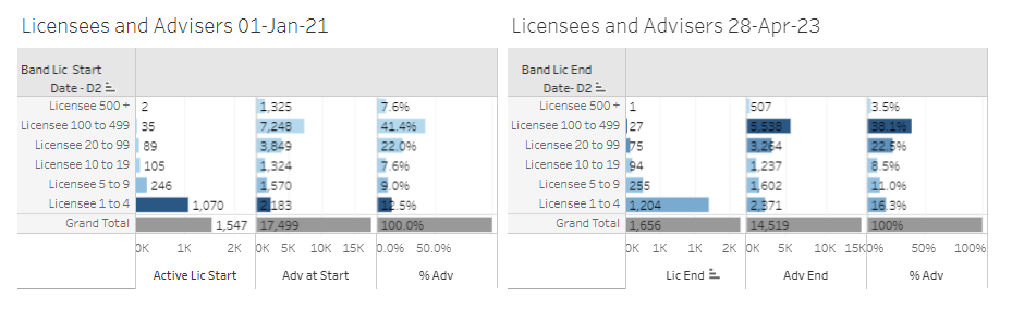 The charts below show total change in licensee since start date of Jan 1, 2021 to April 28, 2023. It shows that the number of licensees dropped from 2,154 (left chart) to 1,827 to today. Adviser numbers dropped from 20,874 to 16,047*