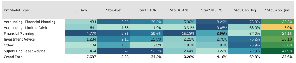 Notes Re Qualifications: *Adv Gen Degree = Advisers who have shown to have a degree of some type under ‘Qualifications and Training’. **Adv App Deg = Advisers who have an AQF qualification classed as Approved Qualifications, previously known as FASEA Approved. Does not include The FASEA Exam.