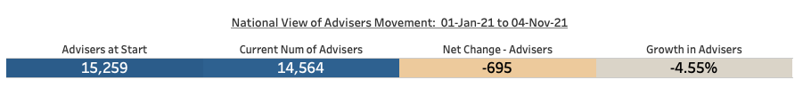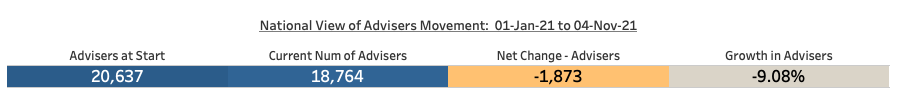 Number of Advisers decreased by (-59) from 18,823 to 18,764